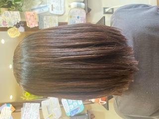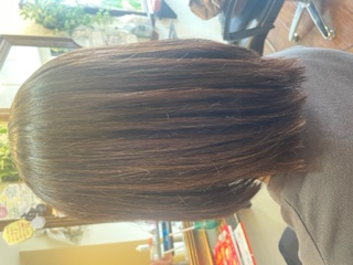半年たつとすその部分のボリュームがまとまりにくくなってきたので縮毛矯正でボリュームを抑え少し外ハネにできる流さにカット!